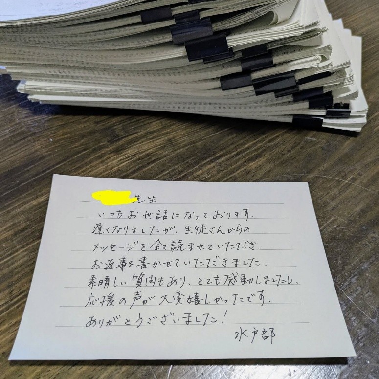 12/18 10月に実施したがん教育「中学生のための世界でいちばんやさしい命の授業」で、生徒さんからいただいた質問やメッセージのお返事を無事に書き終えました。約500名分、2ヶ月かかりました。素晴らしい内容の質問や応援メッセージもいただき、子どもたちにも伝わるものなのだと感動しました。終業式に間に合って、よかったです。
