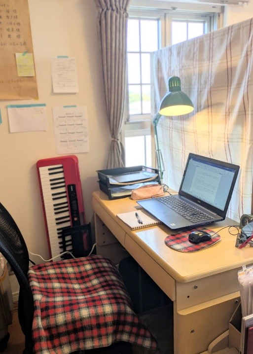 ちなみに、このデスクは12年前、長男が小学生になるときに購入したものを「お上がり」で使っております。布を壁にしているのは、向こう側に収納としても利用している2段ベッドがあるためです。